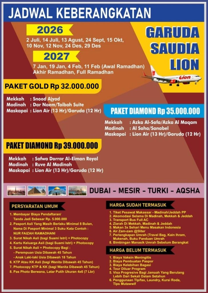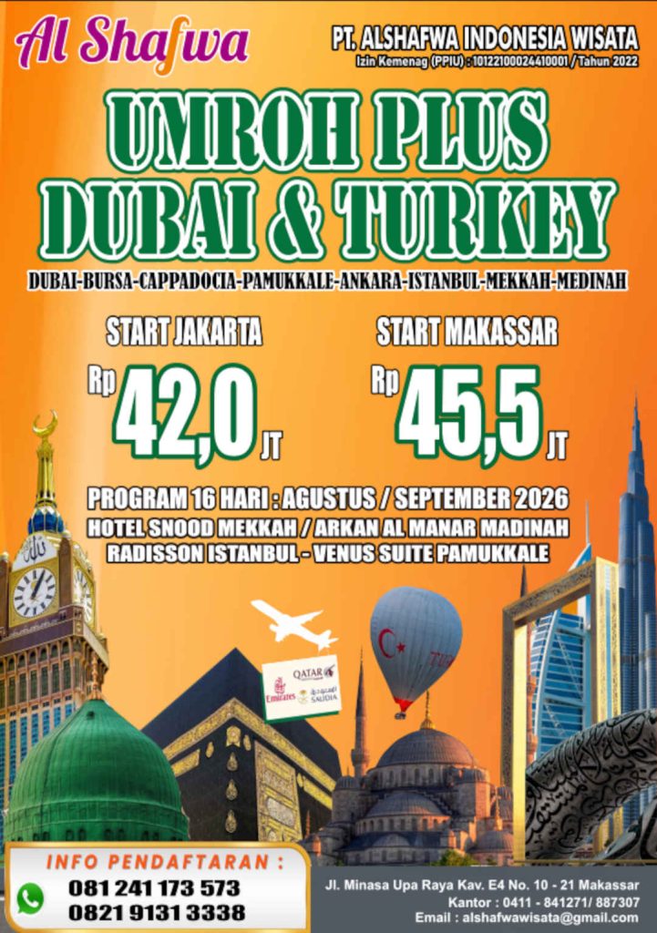 Paket umrah plus Dubai dan Turkey dengan program perjalanan 16 hari dan pilihan pemberangkatan dari Jakarta dan Makassar.